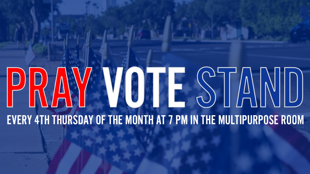In addition to our weekly prayer meetings & our general monthly prayer meeting, we’re launching another monthly prayer gathering “Pray, Vote, Stand”. This prayer gathering is different from our monthly and weekly prayer meetings as “Pray, Vote, Stand” is a gathering that will be committed to prayer, biblical engagement, and cultural impact. In this gathering we will be praying for our communities and leaders, vote and influence government for good, and stand boldly for biblical truth.